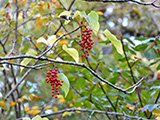 傾いた陽射しが竹林に長い影を引き、葉の色が黄や茶に変わり、実が色づき、公園は秋の彩です。モミジが紅葉し始めると錦秋を迎えます →詳細