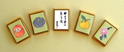 今年は、一口サイズの板チョコ(ミルクチョコ)一つ一つを、それぞれ違う絵柄の実篤の書画の包装紙でくるんだ五個組です。