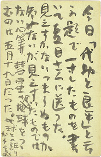 4月6日付けの手紙には「今日『代助と良平』と云ふ題で一寸したものを書いて夏目さんに送つた」とあり、実篤も即座に応えたことが解ります。「見えすかないつまらぬものか知れないが見えすいたものではない心算」と書いたところに控えめながら自信が窺われます。「代助と良平」は12日付けの朝日新聞文芸欄に掲載されました。
