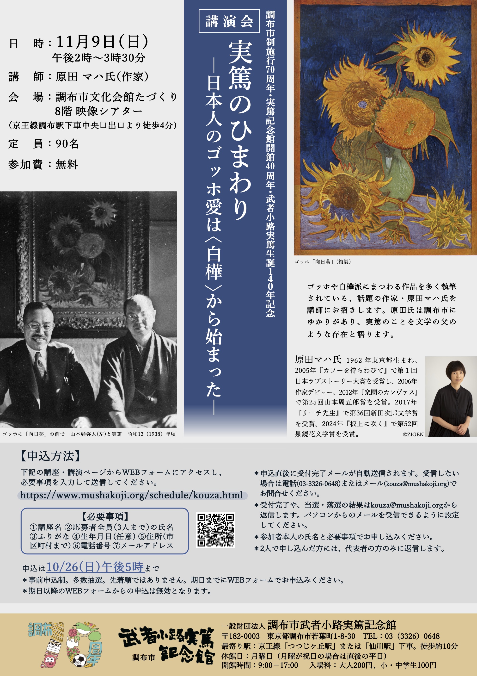 ゴッホや白樺派にまつわる作品を多く執筆されている、話題の作家・原田マハ氏を講師にお招きします。原田氏は調布市にゆかりがあり、実篤のことを文学の父のような存在と語ります。